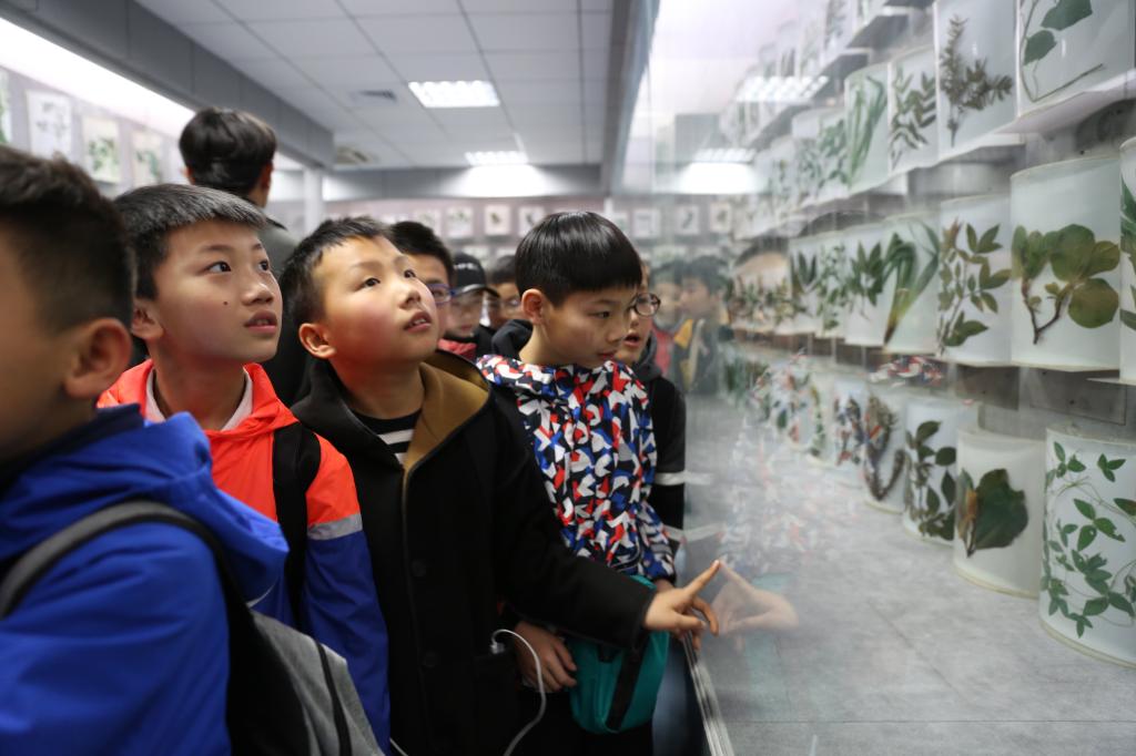 在植物标本馆,明亮玻璃柜里的浸制标本吸引了孩子们的目光,激发了他们认识植物的热情。