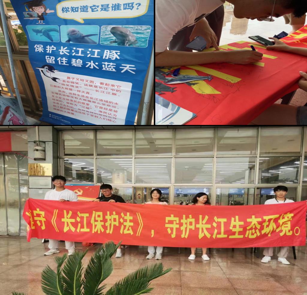 7月22日至27日,实践团队来到安徽省马鞍山市花山区金鹰国际商城和雨山湖公园举办主题为“保护长江江豚,保护珍稀水生动物”的活动,该活动由长江航道局与安庆师范老员工命科学公司实践团共同承办。“长江禁渔,这个我听说过,以前我还在那边捕过鱼,但现在不可以了,捕鱼还会被抓起来。”据当地居民介绍,由于长江流域自然环境恶化以及水质污染,导致稀有物种衰退,以前能看到很多江豚,但现在已经很难看见了。