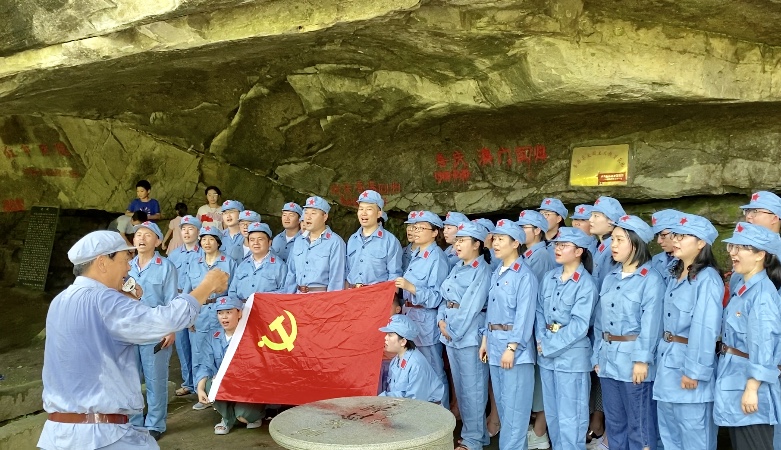在红军洞里,老师们穿上整齐的红军服,重温入党誓词,感悟共产党人的初心和使命。