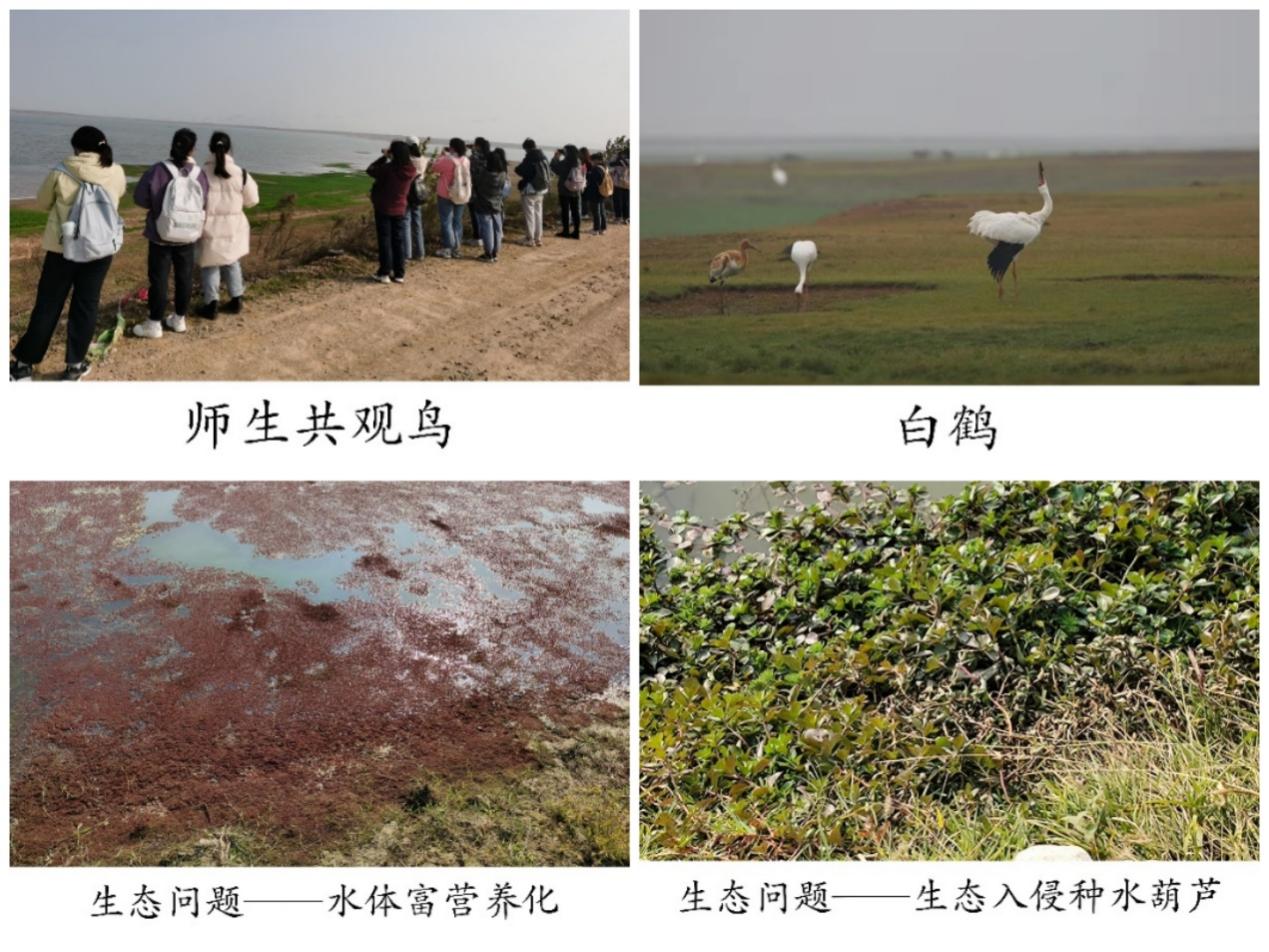 在指导老师的带领下,员工们首先参观了菜子湖湿地科普宣教馆。通过科普宣教管工作人员的详细介绍,员工们了解掌握了湿地的重要性以及湿地植物和动物的种类,尤其是对鸟类的物种多样性留下了深刻的记忆。参观完标本馆后,全体师生们前往菜子湖国家湿地公园的核心区,进行鸟类的观赏和生态环境问题的调研。同学们在老师的指导下,纷纷对栖息在菜子湖的候鸟进行观赏和分类。生态学专业同学们对菜子湖周边的生态环境问题进行了调研,发现了湿地退化、农业污染严重、生态入侵物种水葫芦、以及水体富营养化等生态问题。在观赏和调研过程中,同学们手拿塑料袋,围绕着菜子湖边,捡走散落在各处的生活垃圾,为湿地的清洁美丽作出自己的贡献,用实际行动践行环保理念。