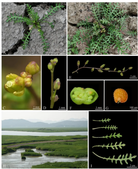近日,植物分类学期刊 PhytoKeys 发表了一篇题为《Rorippa daguanensis (Brassicaceae), a new species from eastern China》的研究论文。这篇论文报道了suncitygroup太阳新城科研人员在七里湖发现的十字花科(Brassicaceae)蔊菜属新物种——大观蔊菜(Rorippa daguanensis)。该种花无花瓣与同属植物无瓣蔊菜(Rorippa dubia)相似,区别在于其茎不明显,植株矮小呈莲座状,果为短角果;果与广州蔊菜(Rorippa cantoniensis)相似,区别在于该种花无花瓣和苞片,果皮褶皱。基于叶绿体基因组建立的蔊菜属系统发育分析表明,该种与广州蔊菜互为姊妹种。