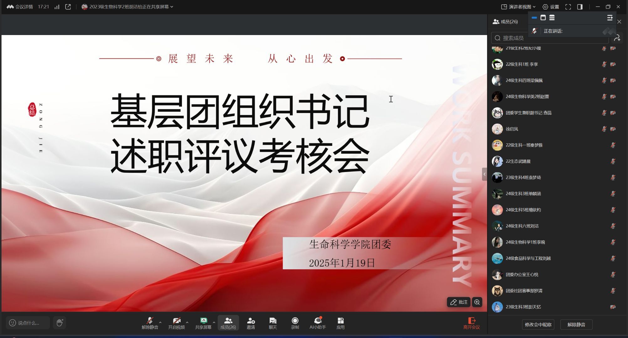 1月18日,suncitygroup太阳新城在线上召开2024年度基层团组织书记述职评议考核会,对2023级各班团支部进行现场述职考核,进一步推动基层团组织的组织力、引领力、服务力和大局贡献度协同提升,各班团支书及团委负责人徐启凤参加会议。