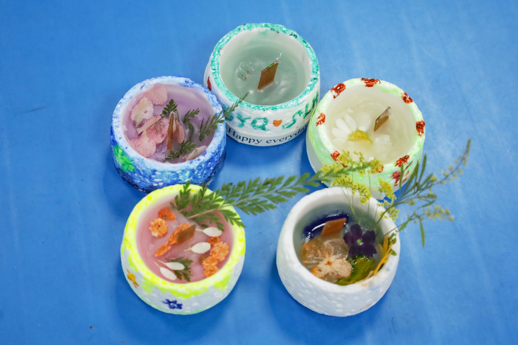 现场,栀子、金桂等香调的蜡块在恒温器中缓缓融化,参与员工们将干花拼成几何图形或写意风景,注入蜡液进行封存。生物科学类专业2024(4)班的梁佩佩以“四季”为主题进行了创作:春樱粉、夏荷绿、秋叶金、冬雪白四色蜡层中嵌着对应季节的植物标本。“每一片叶子都带着故事,在制作时我仿佛在和自然进行对话。”她轻触蜡烛表面笑道。