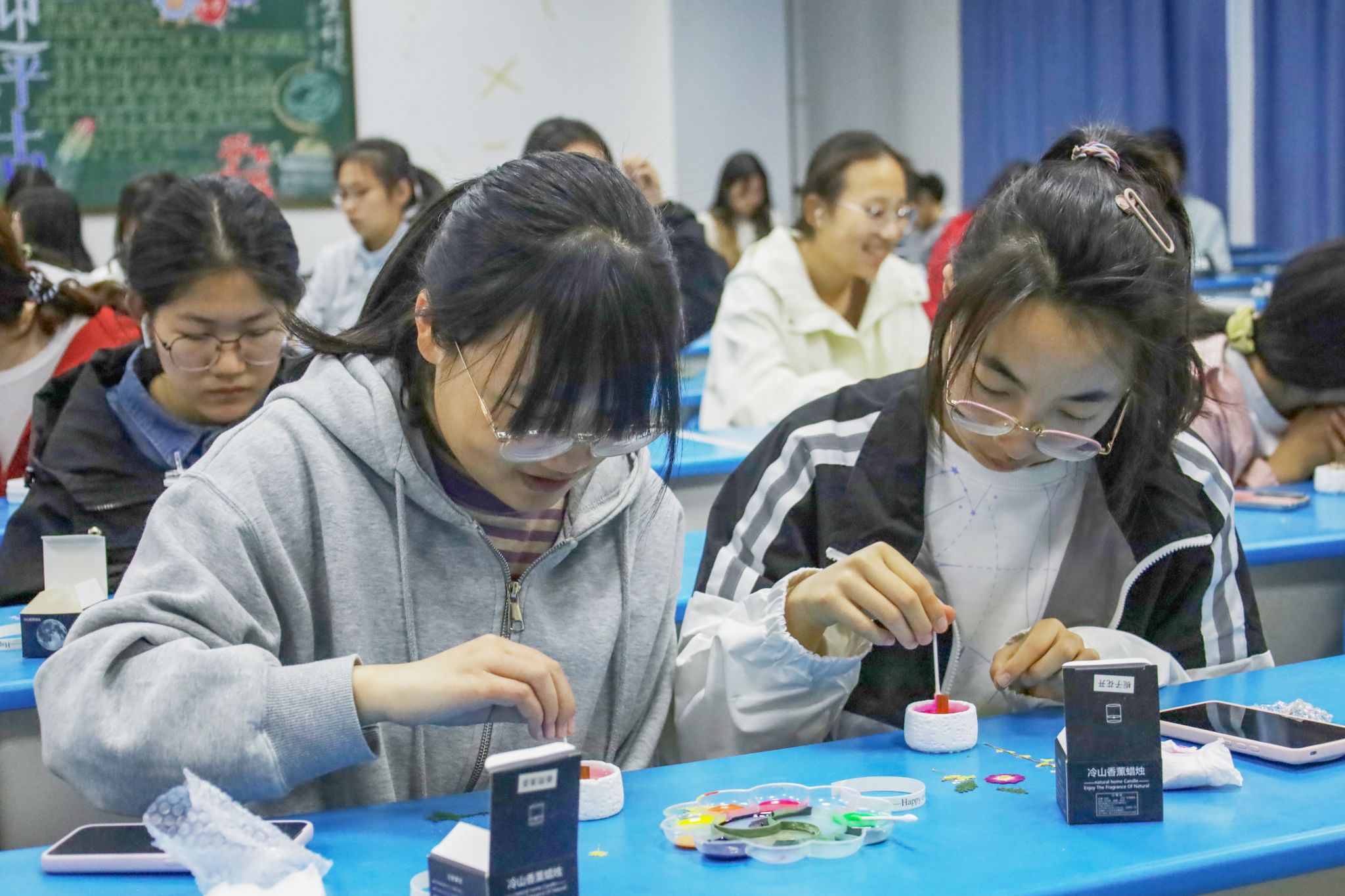 生物科学类专业2024(4)班的汪乐一边用滴管调配薰衣草精油,一边分享体验:“盯着手机刷信息时,焦虑感会叠加,但亲手创作时,注意力完全集中在指尖,压力不知不觉就消散了。”她的蜡烛以星月夜为灵感,蓝紫色蜡液中悬浮着银叶菊,宛如“凝固的星空”。