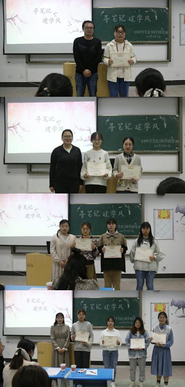 参赛选手展示完毕后,四位评委从笔记工整、形象风度、语言表达、笔记内容等六个方面对每位选手逐一点评并给出建议。最终,工作人员统计现场观众票选和评委打分得出结果。生物科学专业2020(3)班的彭雅婷荣获一等奖,陈旭阳和黄馨悦荣获二等奖,谢雨婷、崔佩婷、宋彤彤荣获三等奖,刘锦、顾玉洁、杨露露、刘琴4位获得优秀奖。