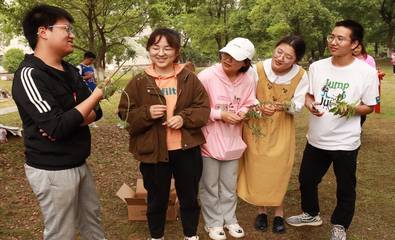 活动开始前,员工们便在校园各处俯身寻“茵”,收集各类植物放在盒中,为之后的“校园识植物”环节做准备。本次活动总负责人、生物技术专业2020(1)班的汪子玄表示,在得知成员们都有植物学这门专业课后,他特地为其“量课定制”这个特殊环节。“‘处处留心皆学问’,希望员工们在采集和认识植物的过程中可以巩固专业课所学的知识,发现生活中的‘知识点’,让专业知识在脑海中不断获取‘养分’。”
