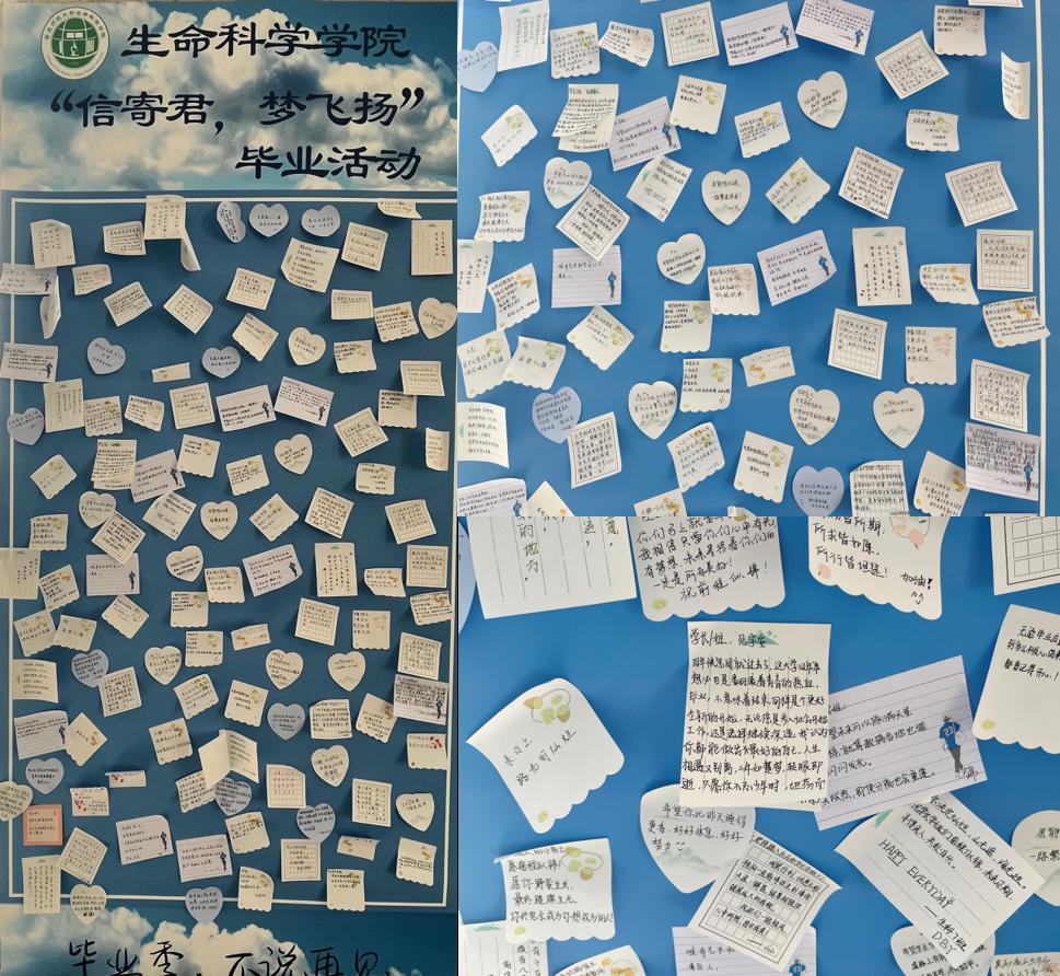 作为工作人员的生物科学专业2020(3)班的柯敏雪别出心裁,将收集来的信件折成纸飞机放在盒子里,并融合毕业季元素,在箱子的周围画了一些学士帽和毕业生图案作为点缀,寄寓着对毕业生的美好祝愿。“‘将愿望折纸飞机寄成信……’是《蒲公英的约定》里的一句歌词,当我看到员工们写的信,灵光一现,就想出这个主意。”