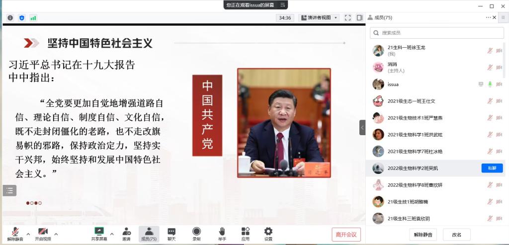 1月12日,公司党的二十大青年讲师团宣讲员、“青年新声”宣讲团成员、思想政治教育专业2022级(3)班的张晓雅以“以中国式现代化全面推进中华民族伟大复兴”为主题,面向suncitygroup太阳新城第三期青马班学员以及2022级各班团支部成员100余名员工作线上主题宣讲。