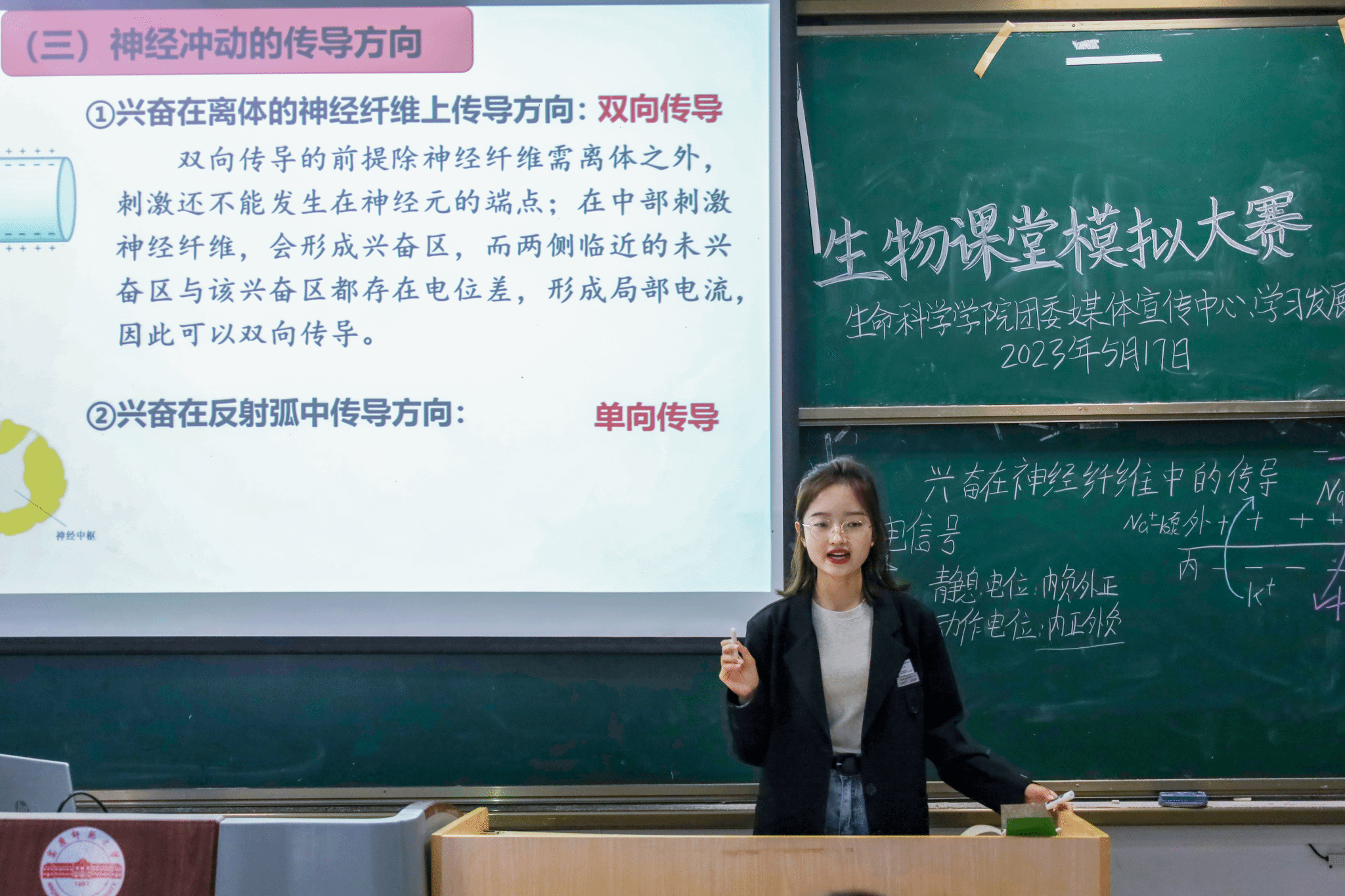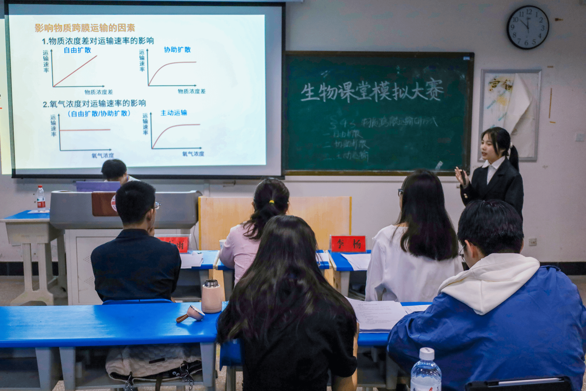 “银烛秋光冷画屏,轻罗小扇扑流萤。”生物科学专业2021(1)班的万景青以古诗《秋夕》为引,推导出萤火虫发光的原理。结合视频、板书和思维导图的教学形式,她进一步论证ATP在机体中直接供能的作用。万景青表示,这是她第一次参加课堂模拟比赛,尽管做了准备,教学中仍有需要改进的地方。“希望自己能够了解更多教学技巧,为未来工作打下坚实基础。”