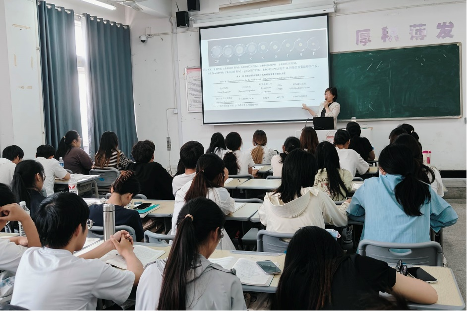 宋晓贺博士详细讲解了蓝莓果实采后贮藏问题、蓝莓贮藏保鲜技术、蓝莓采后病害多维度防控技术、蓝莓鲜果腐烂病生物防控和抑菌保鲜技术发展趋势。她还分享了团队在该领域的最新研究成果,鼓励同学们积极参与相关研究。