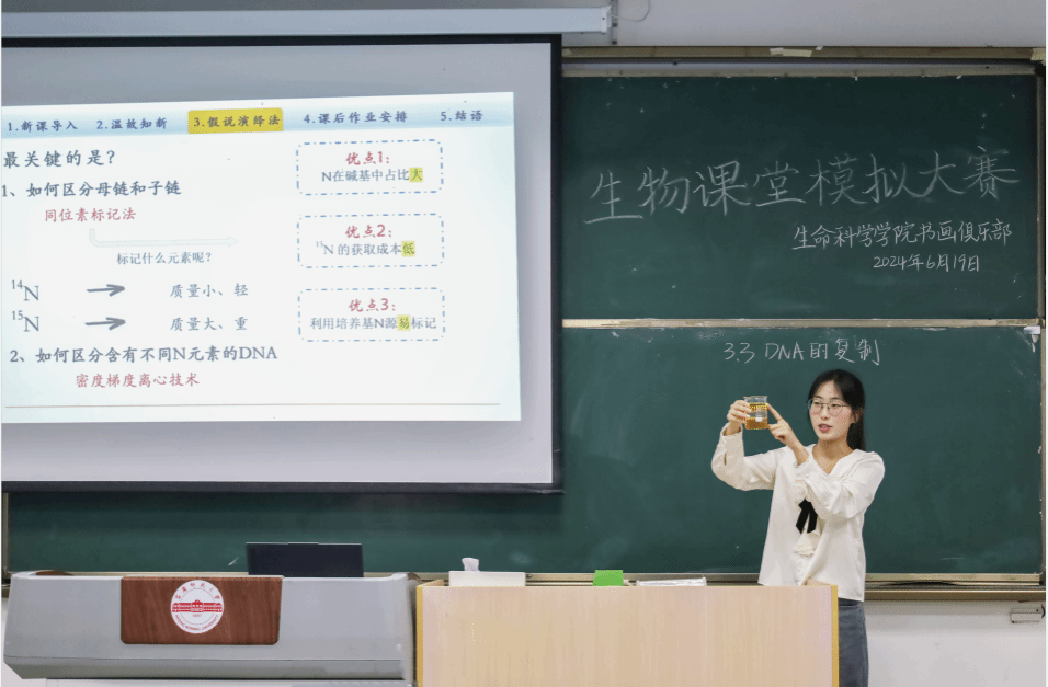 “为了让大家更明显更直观地了解密度梯度离心实验,我做一个模拟实验。”生物科学专业2022(6)班的徐颖睿端起盛有油、水、蜂蜜混合物的烧杯,并分别放入红色导线、火柴以及导线与火柴的结合物,生动地向现场的评委和员工展示实验现象。她表示,此次比赛提高了她制作PPT的能力,锻炼了心理素质,进一步强化了她的专业知识,未来,她将把所学的专业知识和技能应用于生物学教学和科研工作中,通过教学培养更多的生物学人才。