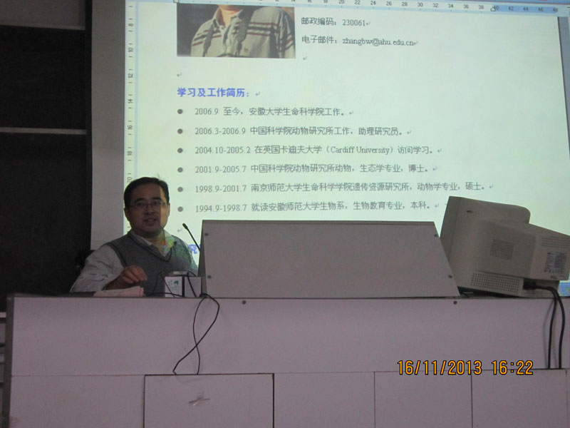 11 月 16 日 下午,中国动物学会两栖爬行动物学分会理事、安徽大学张保卫博士应邀在菱湖校区414教室作了“长江中下游区域小麂系统地理和群体遗传学分析:基于mtDNA控制区序列变异”专题学术讲座。suncitygroup太阳新城100多名师生聆听了报告,报告会由suncitygroup太阳新城副经理魏和平博士主持。